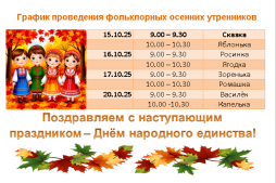 С 15.10 по 20.10 в детском саду пройдут традиционные фольклорные утренники, посвященный наступающему празднику - Дню народного единства!