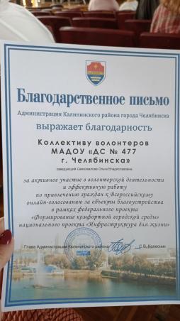 Проведено награждение педагогов Калининского района за их значительный вклад в развитие волонтёрского движения и работу по организации Всероссийского онлайн-голосования за объекты благоустройства. Отмечен и коллектив МАДОУ "ДС№477 г.Челябинска"